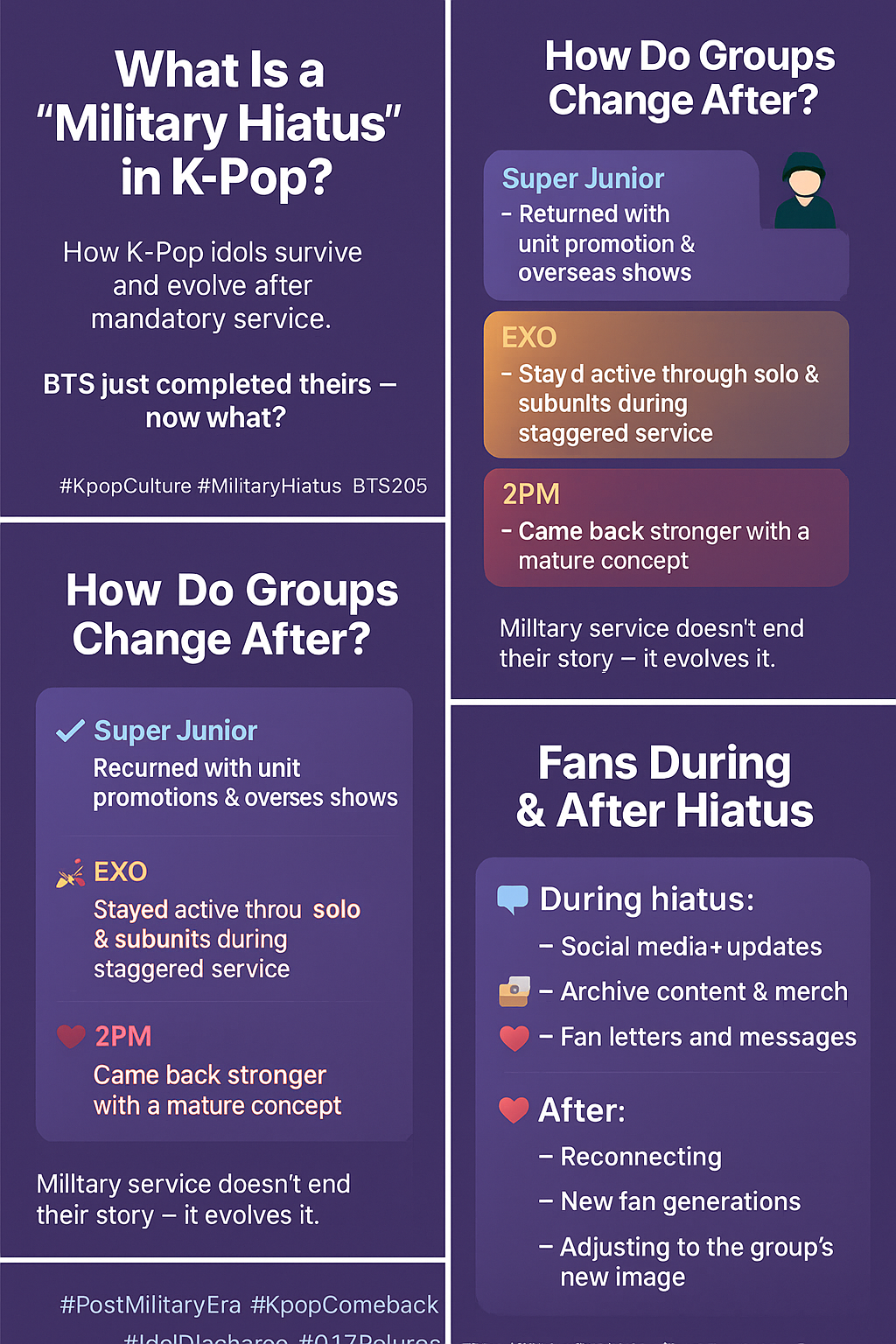📌 What Is “Military Hiatus” in K‑Pop? How Idol Groups Evolve After Discharge (K‑Pop의 ‘군백기’ 문화, 전역 후 그룹들은 어떻게 달라졌을까?)